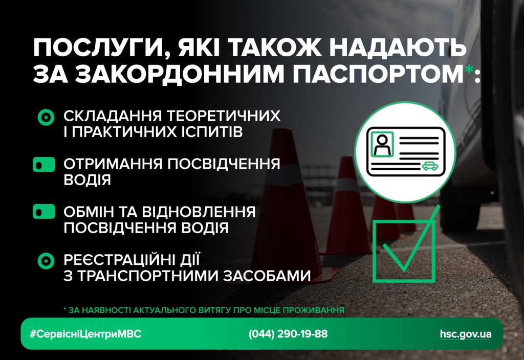 Детальна інформація щодо отримання послуг, пов’язаних із реєстраційними діями з транспортними засобами, розміщена на нашому сайті за посиланням . Детальніше ознайомитися з умовами отримання, обміну та відновлення посвідчення водія можливо тут .