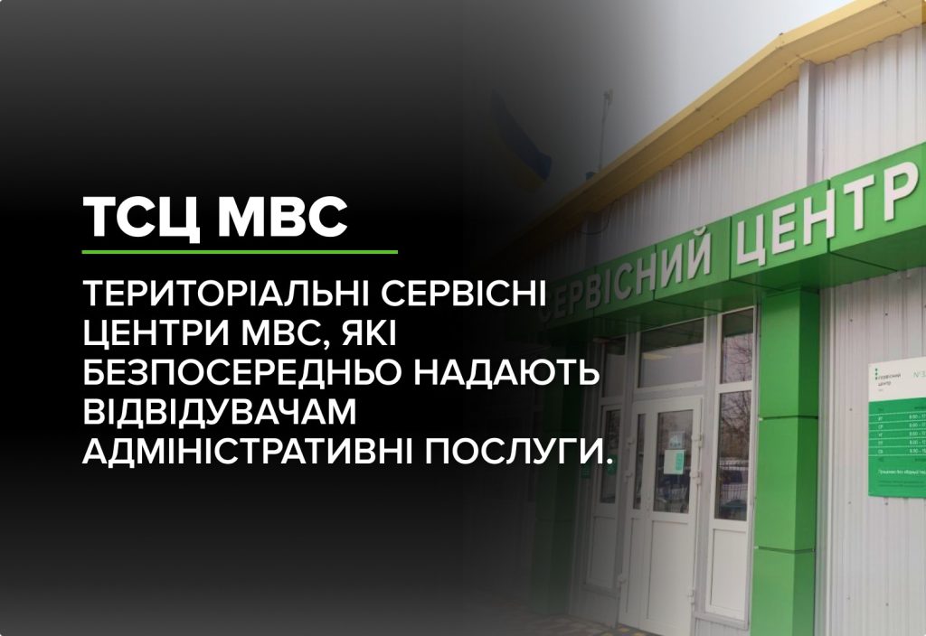 ТСЦ МВС – це територіальні сервісні центри МВС, які безпосередньо надають відвідувачам адміністративні послуги. Вони підпорядковуються регіональному сервісному центру МВС своєї області, який об’єднує кілька регіонів. До ТСЦ МВС громадяни можуть звертатись, аби отримати такі послуги: