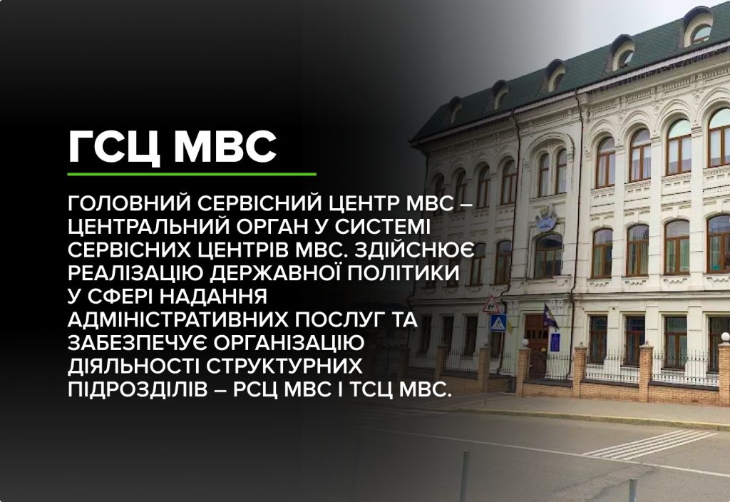 ГСЦ МВС – Головний сервісний центр МВС – центральний орган у системі сервісних центрів мвс. Здійснює реалізацію державної політики у сфері надання адміністративних послуг та забезпечує організацію діяльності структурних підрозділів – РСЦ МВСі ТСЦ МВС. Зокрема: