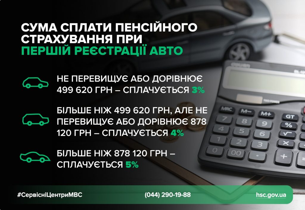 За першої державної реєстрації легкового автомобіля в Україні власник сплачує збір на державне пенсійне страхування. Цей платіж є одноразовим та обов’язковим як для нових транспортних засобів з автосалону, так і вживаних, що були ввезені з-за кордону.