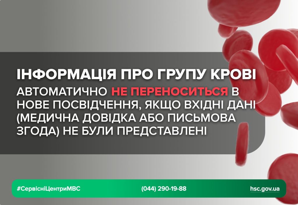 Таким чином, інформація про групу крові автоматично не переноситься у нове посвідчення, якщо вхідні дані (медична довідка або письмова згода) не були надані.