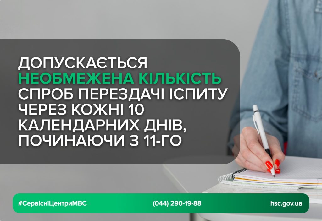 Якщо не вдалося скласти іспит з першого разу, не варто засмучуватись. Наразі допускається необмежена кількість спроб через кожні 10 календарних днів, починаючи з 11-го. Цей час виділяється для того, щоб кандидат у водії міг краще підготуватися. У майбутніх кермувальників є необмежена кількість спроб для складання теоретичного іспиту. Вартість складання теоретичного іспиту – 250 грн.