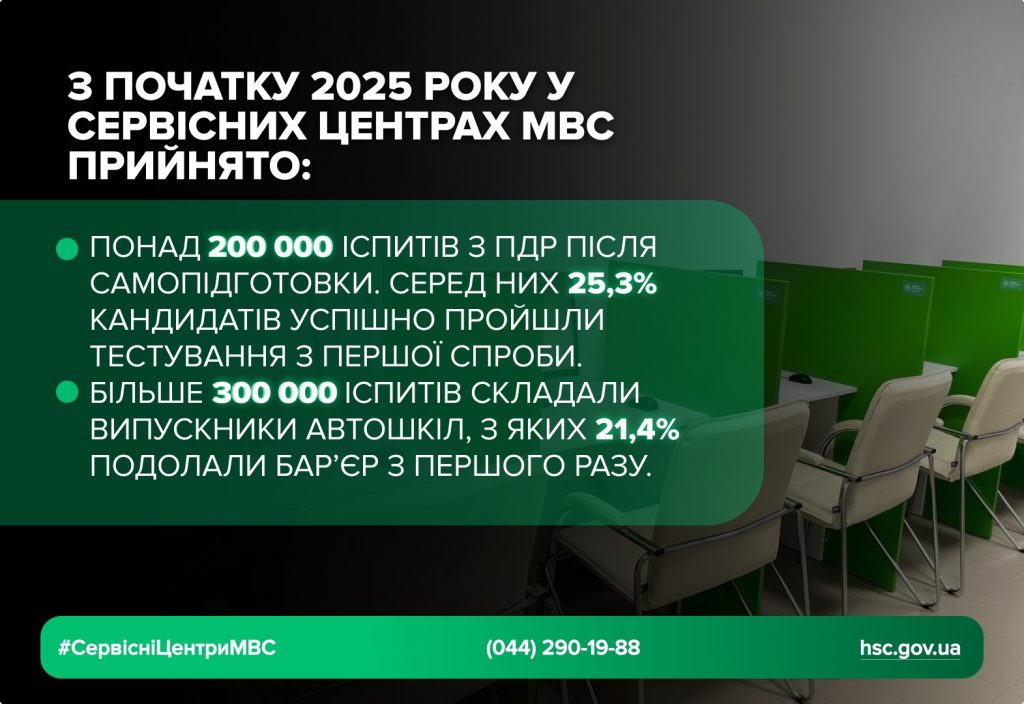 Понад пів мільйона теоретичних іспитів прийняли сервісні центри МВС по всій Україні з початку 2025 року. Близько чверті кандидатів у кермувальники з першої спроби складають тестування з правил дорожнього руху.