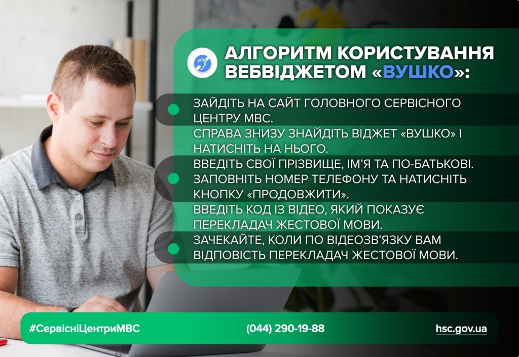 На офіційному вебсайті Головного сервісного центру МВС встановлено спеціалізований вебвіджет «Вушко», який забезпечує вільний та комфортний доступ громадян із порушеннями слуху до інформації, консультацій чи іншої допомоги онлайн – швидко, зручно та без потреби виходити з дому.