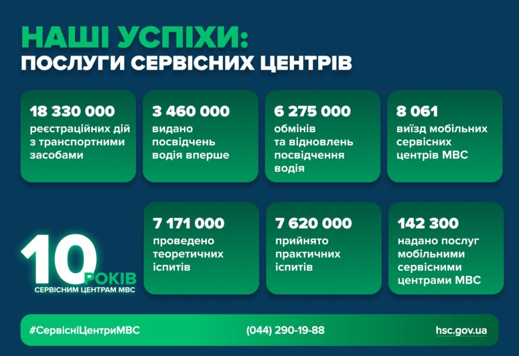 Зараз в Україні працює 143 сервісних центри МВС та 23 мобільних підрозділів, які надають адміністративні послуги громадянам по всій Україні. За 10 років діяльності сервісні центри МВС надали мільйони послуг: