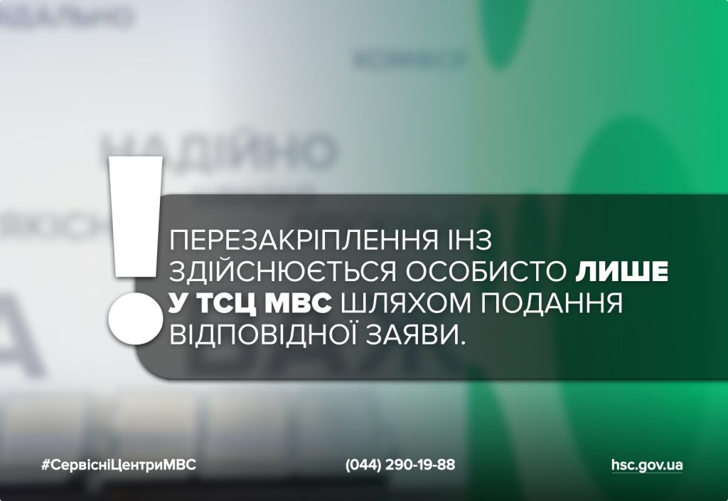 Після розгляду питання про перезакріплення в ТСЦ МВС проводиться перереєстрація транспортного засобу, і заявник отримує нове свідоцтво про реєстрацію з відміткою про ІНЗ.