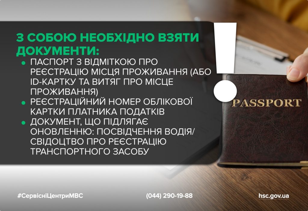 • документ, що підлягає оновленню: посвідчення водія/  свідоцтво про реєстрацію транспортного засобу.