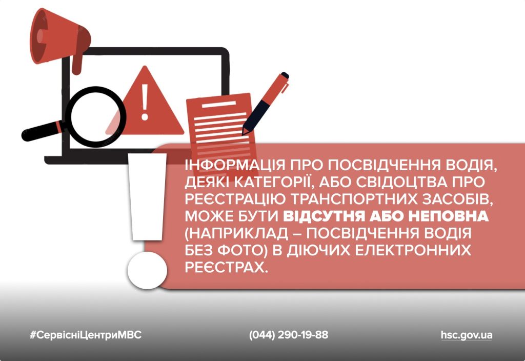 Нагадуємо, що дані про водійські документи автоматично не переносяться з паперових архівів та попередніх реєстрів до сучасних електронних реєстрів. Адже велика частина з них була створена ще до цифровізації державних послуг. Тому інформація про посвідчення водія, деякі категорії, або свідоцтва про реєстрацію транспортних засобів, може бути відсутня або неповна (наприклад – посвідчення водія без фото) в діючих електронних реєстрах.