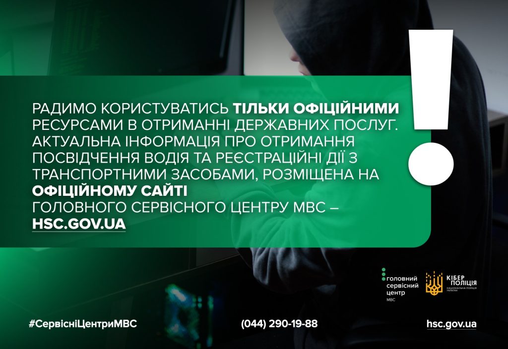 Радимо користуватись тільки офіційними ресурсами в отриманні державних послуг. Актуальна інформація про отримання посвідчення водія та реєстраційні дії з транспортними засобами, розміщена на офіційному сайті Головного сервісного центру МВС – hsc.gov.ua. Перевіряйте, чи сторінка має верифікацію або веде на домен gov.ua, який означає, що сайт належить органу державної влади.