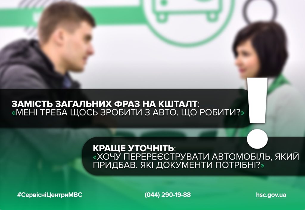 Замість загальних фраз на кшталт: «Мені треба щось зробити з авто. Що робити?» краще уточнити: «Хочу перереєструвати автомобіль, який придбав. Які документи потрібні?»