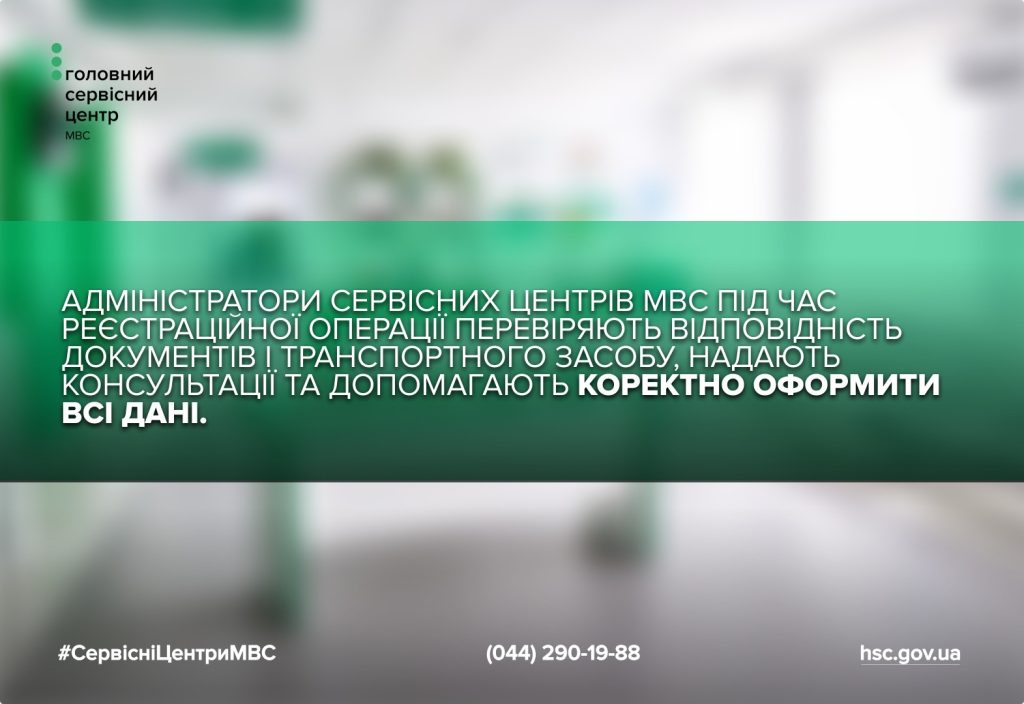 Адміністратори сервісних центрів МВС під час реєстраційної операції перевіряють відповідність документів та транспортного засобу, надають консультації та допомагають корректно оформити всі дані.