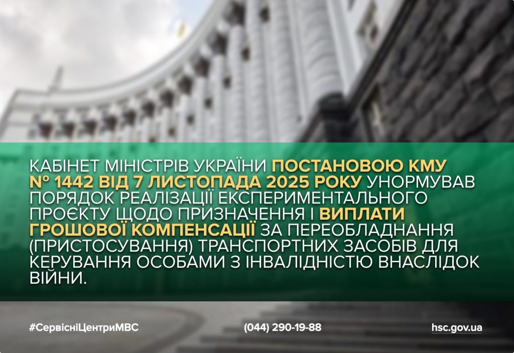 Кабінет Міністрів України постановою КМУ № 1442 від 07 листопада 2025 року унормував порядок реалізації експериментального проєкту щодо призначення і виплати грошової компенсації за переобладнання (пристосування) транспортних засобів для керування особами з інвалідністю внаслідок війни.