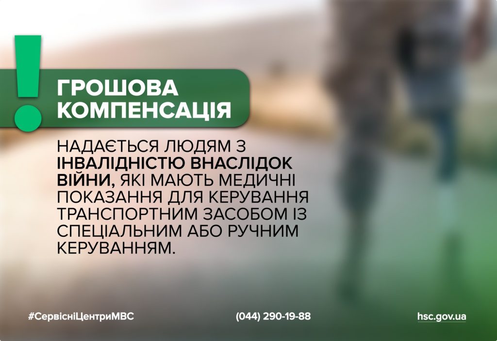 Грошова компенсація надається людям з інвалідністю внаслідок війни, які мають медичні показання до керування транспортним засобом із спеціальним або ручним керуванням.