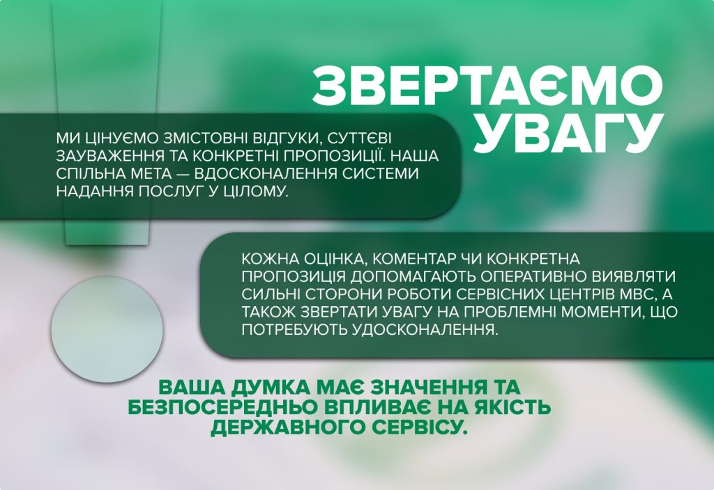 Допоможи нам стати краще — залиш свій відгук у «Твій ГСЦ МВС». Сервісні центри МВС відкриті до змін і працюють заради зручності громадян. Нам важлива кожна думка, адже саме відвідувачі проходять увесь шлях отримання послуг і найкраще бачать, що працює ефективно, а що потребує вдосконалення. Саме такі конструктивні пропозиції можуть стати основою для позитивних змін у роботі сервісних центрів МВС.