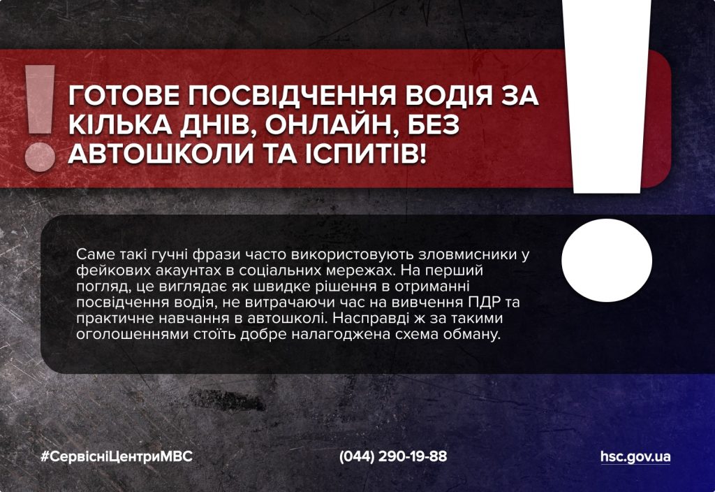 «Готове посвідчення водія за кілька днів, онлайн, без автошколи та іспитів». Саме такі гучні фрази часто використовують зловмисники у фейкових акаунтах в соціальних мережах. На перший погляд, це виглядає як швидке рішення в отриманні посвідчення водія, не витрачаючи час на вивчення ПДР та практичне навчання в автошколі. Насправді ж за такими оголошеннями стоїть добре налагоджена схема обману. Замість готових документів – люди втрачають гроші та персональні дані.