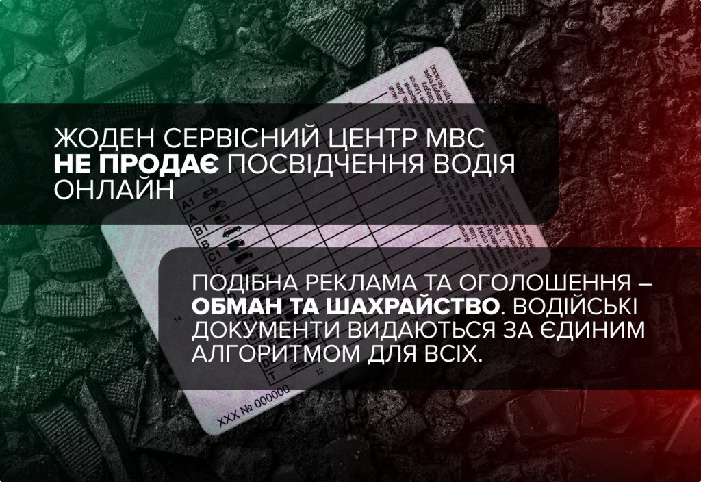 Жоден сервісний центр МВС не продає посвідчення водія онлайн. Подібна реклама та оголошення – обман та шахрайство. Водійські документи видаються за єдиним алгоритмом для всіх. Щоби отримати посвідчення водія, необхідно вивчити правила дорожнього руху за самопідготовкою або в автошколі, скласти теоретичний іспит в ТСЦ МВС, пройти практичне навчання в автошколі. Останній етап – скласти практичний іспит в сервісному центрі МВС. Лише після цього посвідчення водія видається особисто власнику в руки та після пред’явлення документа, що посвідчує особу.