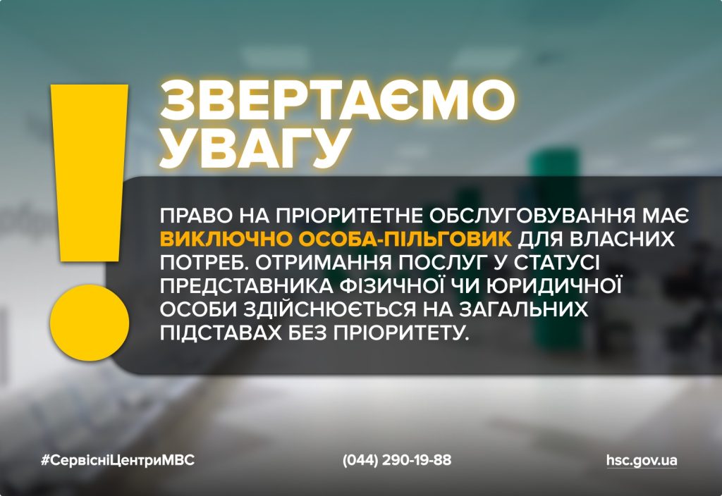 Право на пріоритетне обслуговування має виключно особа-пільговик для власних потреб. Отримання послуг у статусі представника фізичної чи юридичної особи здійснюється на загальних підставах без пріоритету.