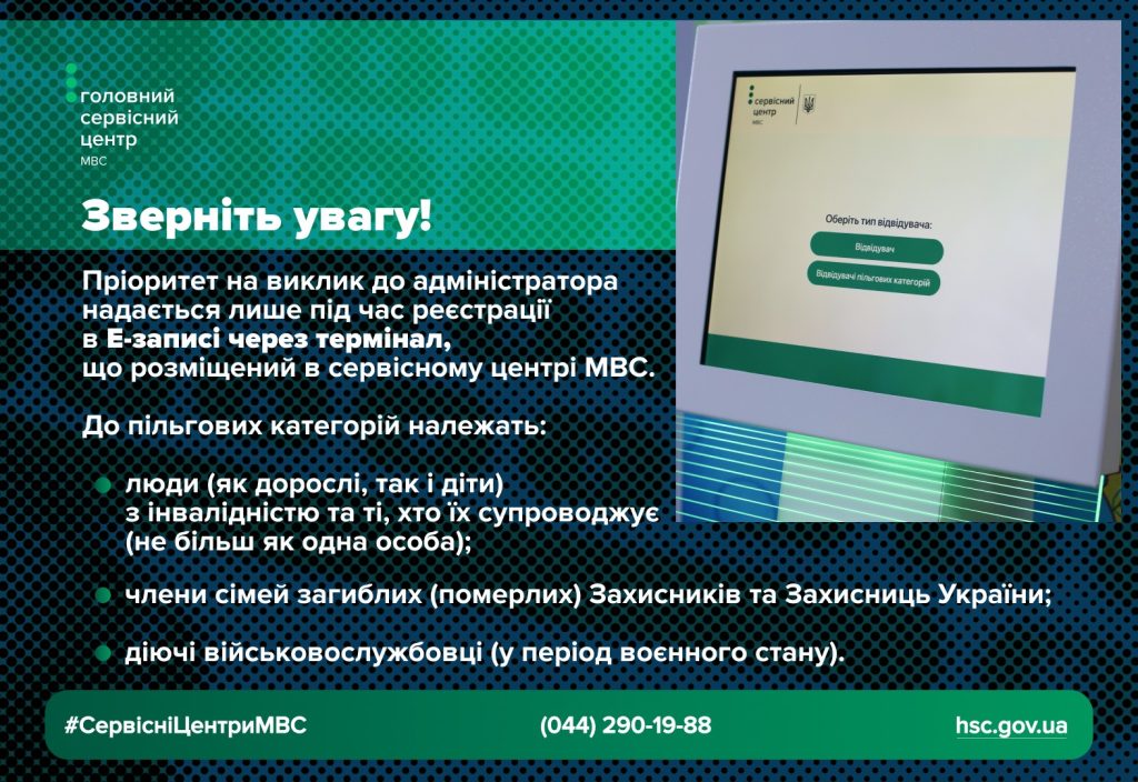 Звертаємо увагу, що пріоритет на виклик до адміністратора надається лише під час реєстрації в Е-записі через термінал, що розміщений в сервісному центрі МВС. До пільгових категорій належать: