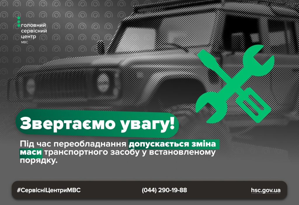 Звертаємо увагу: під час переобладнання допускається зміна маси транспортного засобу у встановленому порядку. Вона є технічною характеристикою, закладеною в конструкцію транспортного засобу.